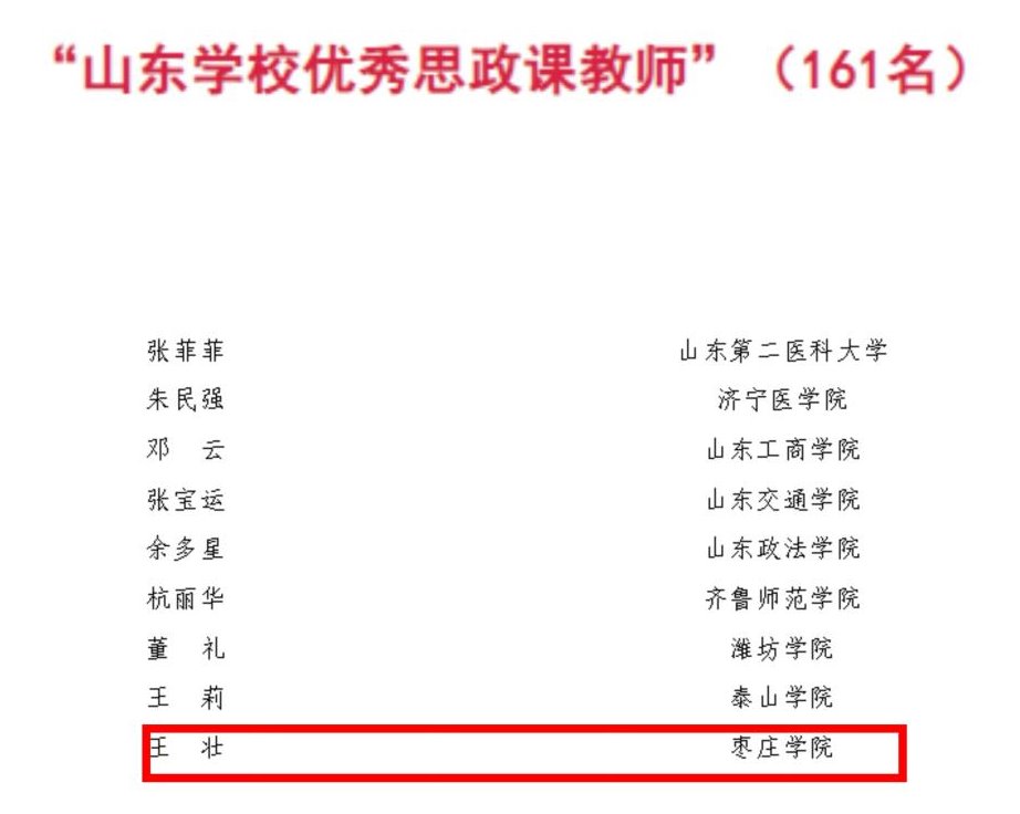 根据中共山东省委教育工委《关于组织开展2023年“山东学校思政课教师年度人物”“山东高校辅导员年度人物”宣传选树工作的通知》要求,我院通过遴选推荐王壮老师参加评选。近日,经过地市(高校)推荐、材料审核、专家评审、现场答辩等环节,王壮老师以高超的教学本领、先进的教学理念以及优秀的教学成果获评“山东学校优秀思政课教师”,充分展示了我院思政课教师的良好风采。王壮老师的出色表现,也为思政课教师树立了良好的榜样示范作引领用。
