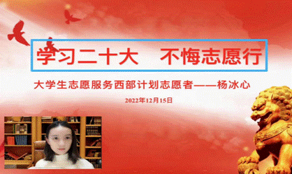 我院组织西部计划志愿者优秀代表杨冰心以亲身经历、切身感受宣讲党的二十大精神,鼓舞广大在校学生牢记党和国家对青年的嘱托,以实际行动响应国家“到祖国和人民最需要的地方去”的号召,与新时代同频共振,让青春在全面建设社会主义现代化国家的火热实践中绽放绚丽之花。
