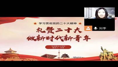 12月7日,我院团总支书记薛斐老师利用腾讯会议以《用习近平新时代中国特色社会主义思想武装广大团员青年》为题作了党的二十大精神“云宣讲”,号召广大团员青年自觉做习近平新时代中国特色社会主义思想的坚定信仰者、忠实实践者,让马克思主义中国化时代化最新成果在中国大地上充分展现出实践伟力,闪耀出更炫丽的真理光芒。
