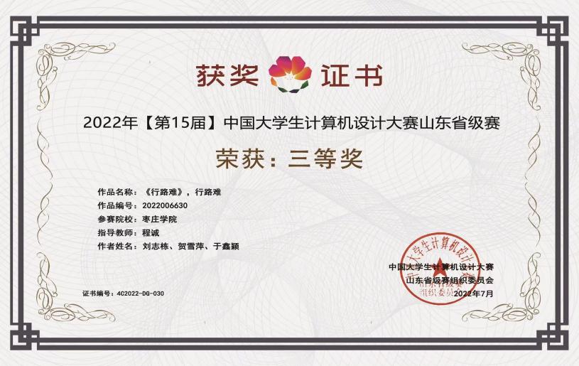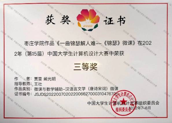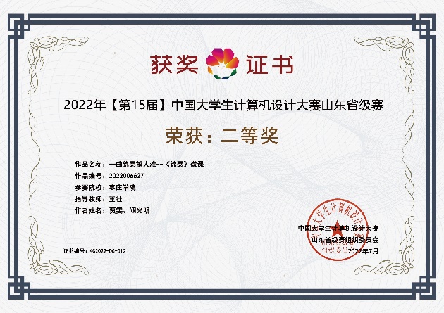 近日,2022年(第15届)中国大学生计算机设计大赛圆满落幕。经过激烈角逐,我院王壮老师指导的贾雯团队(搭档传媒学院学生阚光明)作品“一曲锦瑟解人难——《锦瑟》微课”荣获 “微课与教学辅助类” 全国总决赛三等奖、山东省级赛二等奖。程诚老师指导的刘志栋、贺雪萍、于鑫颖团队作品“《行路难》、行路难”获得“微课与教学辅助类”山东省级赛三等奖。