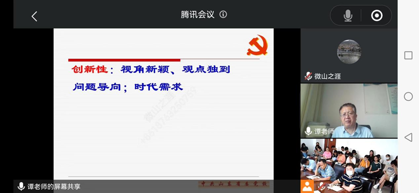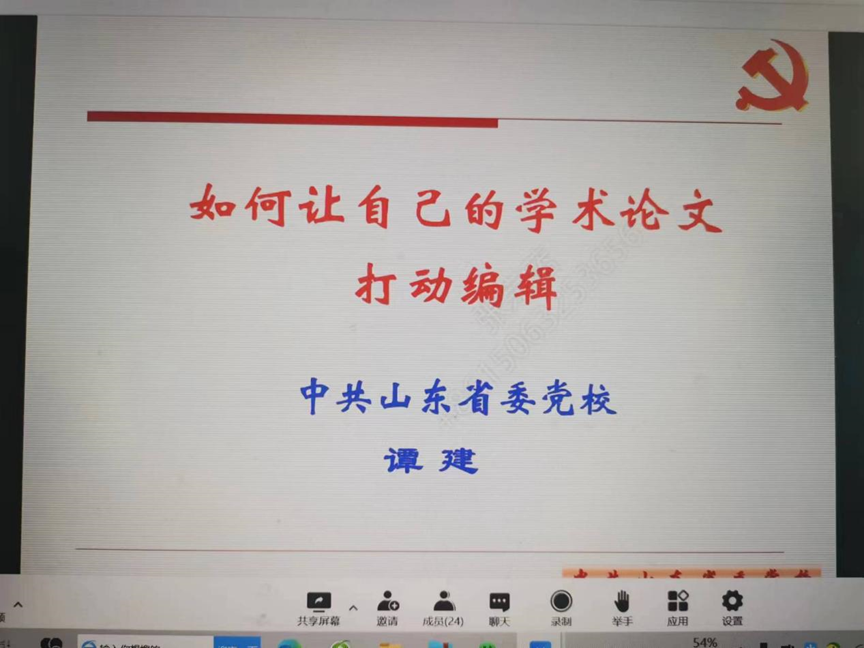 为进一步提高教师高水平学术论文写作能力,6月17日下午,由社会科学处主办、tyc7111cc太阳成集团承办的“名师大讲堂”第十一场学术报告会,在新城校区豁然楼A315室举行。中共山东省委党校校刊编辑部主任,谭建教授应邀为全校师生作“如何让自己的学术论文打动编辑”的专题报告。报告会由tyc7111cc太阳成集团院长陶道强教授主持,全校师生100余人通过腾讯会议参加报告会。