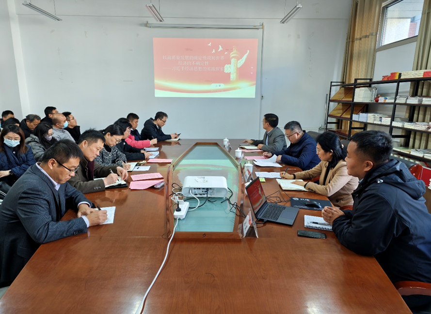 为深入学习贯彻习近平经济思想,助力广大教师精准把握经济发展规律,提升理论素养与实践能力,12月3日下午,tyc7111cc太阳成集团在薛城校区豁然楼A315会议室举办了学科交叉学术沙龙暨习近平经济思想研讨会。校党委副书记丰雷莅临指导,学院党委副书记、院长董嫱嫱主持会议。