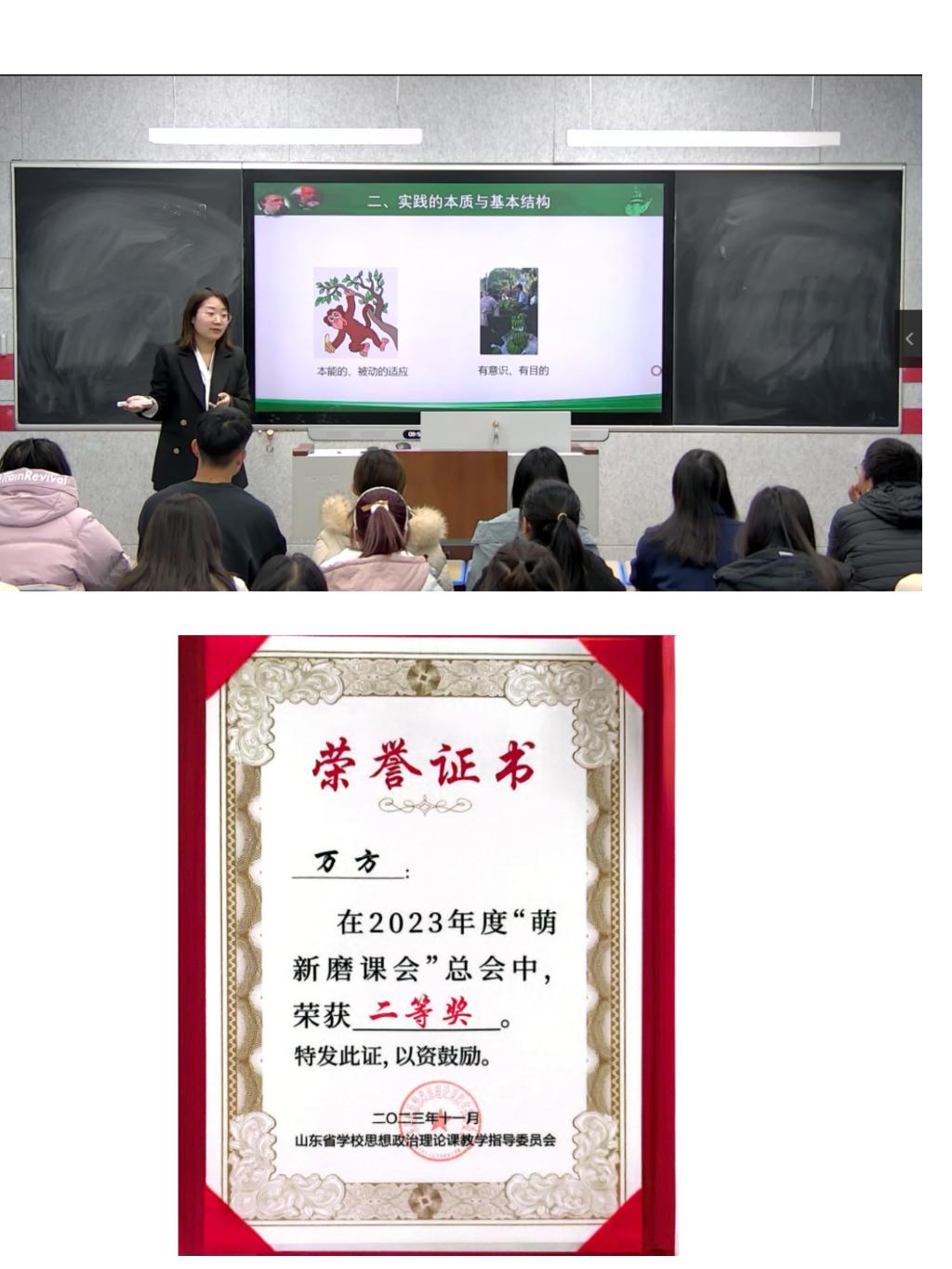 万方,女,中共党员,作为先锋岗的一份子,她从一线接触学生的角度出发,从学生的成长、教育理念、课程设计和自我教育等方面着手,在教学实践中,她不仅关注把握思政教育的本质和特点,更注重培养学生具有社会责任感、创新意识和实践能力,从而积极引导学生在校园中发挥自己的潜能。她致力于将思政教育融入学生的日常生活,组织开展各类主题实践活动,带领学生深入社区、乡村,进行社会调研和志愿服务,让学生在实践中感受马克思主义的生命力和现实价值。她对学生真诚关爱,真正实现现代教育“一切为了学生,为了一切学生,为了学生的一切”的要求。在学生的心中,她是可信、可敬、可靠的良师益友。她帮学生排忧解难,跟学生亦师亦友,既教书又育人,坚持知识传授与价值引领相结合。她坚持从把握学生的成长成才规律和身心特点出发,设计以“生活化教学”为主要侧重点的思政课教学方案,营造民主、平等、和谐的课堂氛围,形成情理交融、清新灵动的教学风格,努力增强思政课的吸引力、亲和力、感染力、影响力,让思政课堂有温度、有深度。她本人主持市厅级科研课题4项、校级教改课题一项,并发布多篇学术论文,在山东高校思想政治理论课2023年度“萌新磨课会”总会上荣获本科组“马克思主义基本原理”课二等奖。