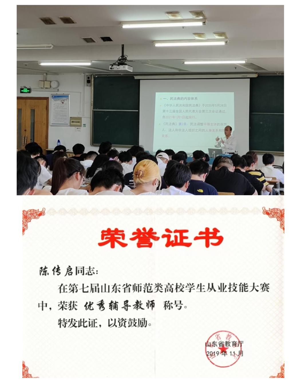 陈传启,男,中共党员,副教授。他作为先锋岗的一员,始终秉持着对马克思主义理论的坚定信仰和对教育事业的无限热忱。在课堂教学中,他精心设计每一堂课,将深奥的马克思主义原理用生动鲜活的案例、深入浅出的讲解呈现给学生,激发学生对理论学习的兴趣和热情。他积极引导学生开展课堂讨论、小组探究,培养学生的批判性思维和独立思考能力,让学生不仅知其然更知其所以然。同时,他利用课余时间为学习困难的学生进行一对一辅导,耐心答疑解惑,助力学生在学业上不断进步,以实际行动践行着不让一个学生掉队的承诺。在陈传启老师的精心指导下,已有数十名同学顺利考入全国重点大学法律硕士研究生。在2019年第七届山东省师范类高校学生从业技能大赛上,他所指导的四名同学,获一等奖1人、二等奖2人。他本人荣获第七届山东省师范类高校学生从业技能大赛“优秀辅导教师”。