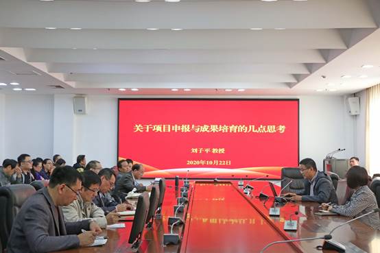 10月22日下午,应我校邀请,聊城大学刘子平教授在综合楼三楼会议室,作题为“关于项目申报与成果培育的思考”的专题报告。本次报告会由社会科学处主办,tyc7111cc太阳成集团承办。tyc7111cc太阳成集团副院长陶道强主持报告会,社科处何芳处长出席,相关学院教师代表80余人参加。