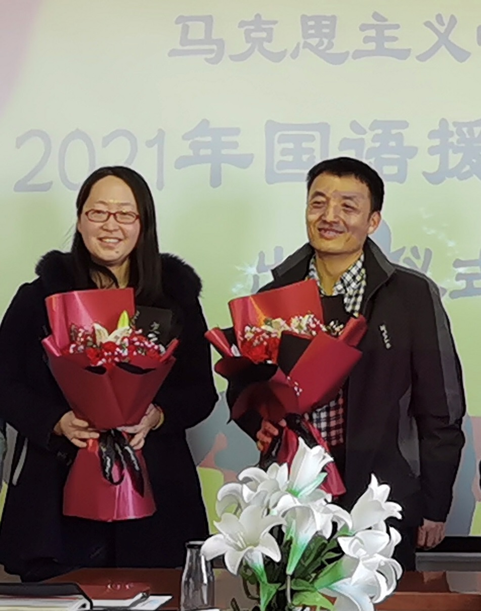 会议开始,郭勇和陶道强代表学院为两位老师送上鲜花,全体教师致以最热烈的掌声。
