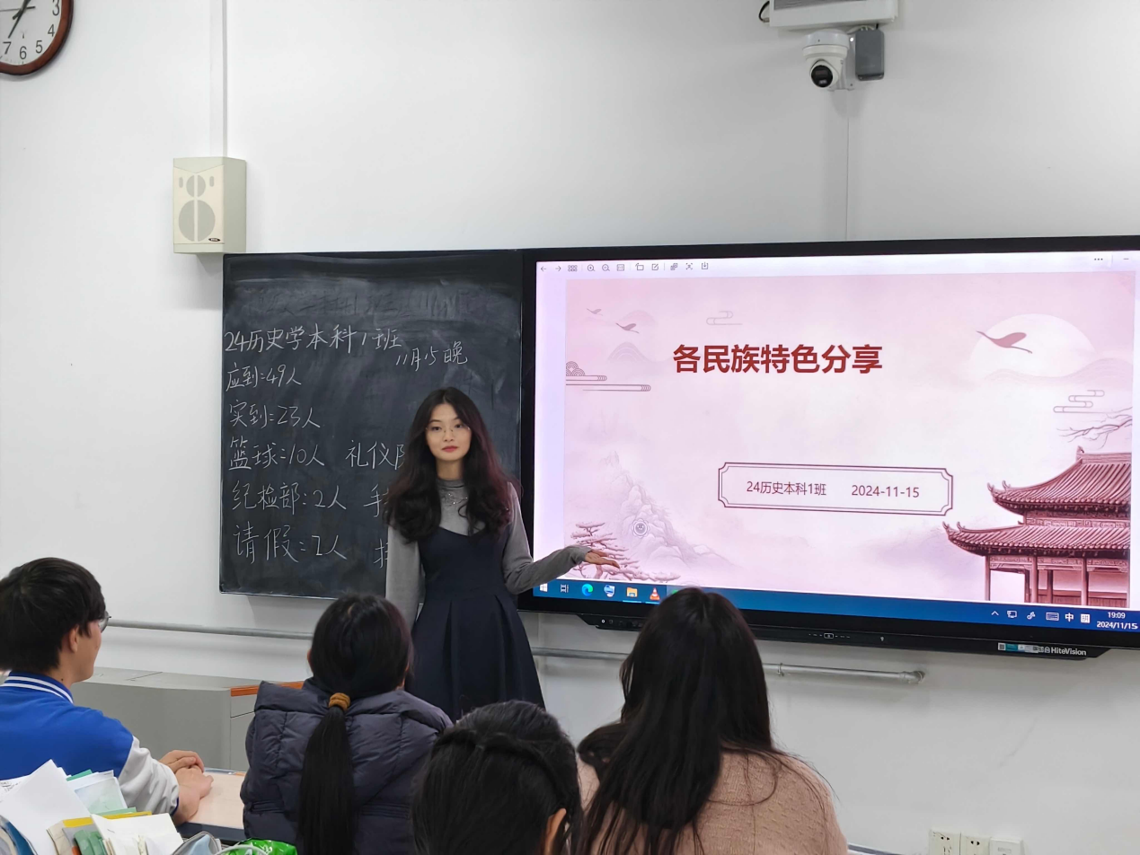 党中央高度重视民族工作,着眼培育中华民族共同体意识,创新推进民族团结进步创建,取得显著成绩。民族团结是我国各族人民的生命线,各民族共同团结进步、共同繁荣发展是中华民族的生命所在、力量所在、希望所在。为增进同学们对中华民族多元文化的了解,促进民族团结,11月12日,24级政治教育和历史学本科1班在崇德楼518、519教室各举办一场以“民族文化分享会”为主题的团日活动。